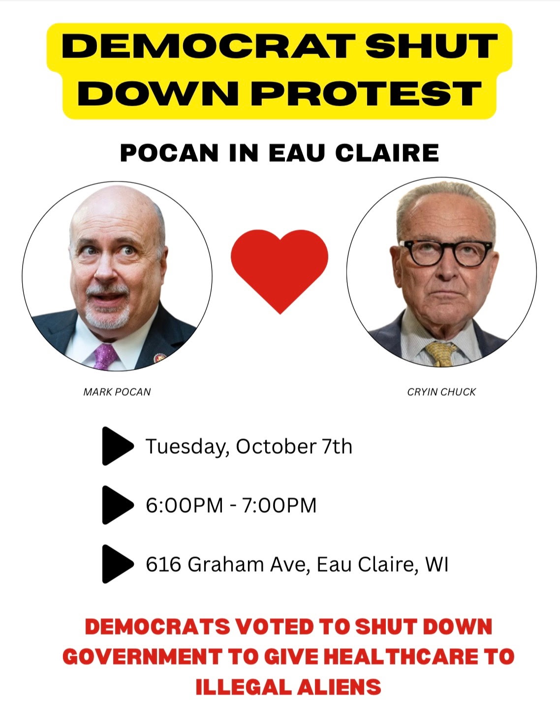 Welcome to RPDC Blow Your Horn Quick Communication in regards to today's Democrat Federal Government Shutdown Protest to commence at 6:00 pm this evening until 7:00 pm at 616 Graham Avenue, Eau Claire, Wisconsin. The Democrats voted to shut down the federal government to give healthcare to illegal aliens. This would be a way to show that we oppose in paying illegals healthcare through our tax dollars. This is a peaceful protest.