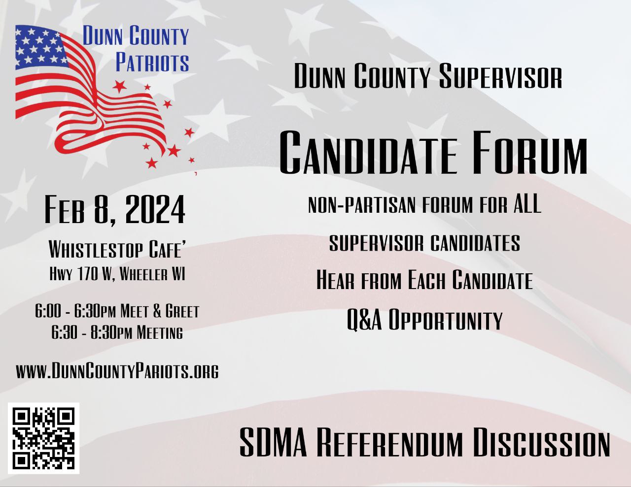 The Dunn County Patriots are hosting a local candidate forum and SDMA referendum discussion this Thursday night. It is free and open to the public.