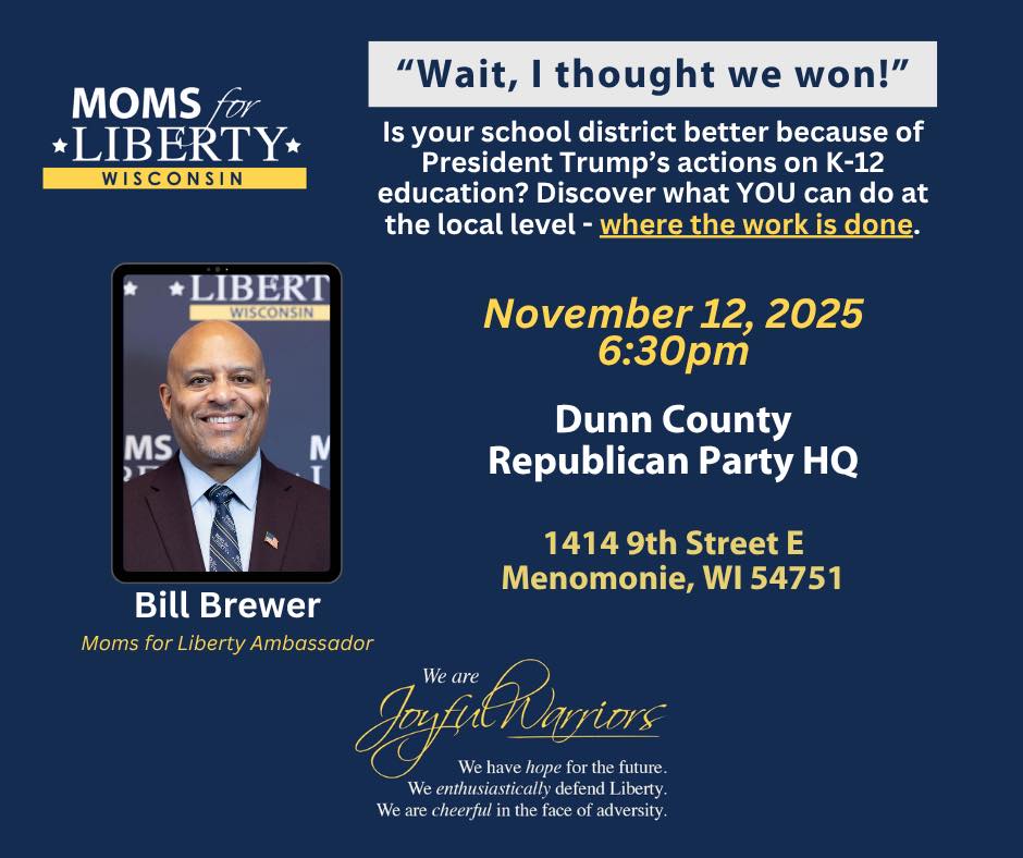 Welcome to this week's RPDC Blow Your Horn Weekly Communication. I hope you are enjoying this weekend so far. Whether it is raking leaves, getting your house and family ready for winter or preparing for the Thanksgiving holiday, it is all good. I thought I would let you know that on Wednesday, November 12th starting at 6:30 pm Moms For Liberty Ambassador, Bill Brewer will be at headquarters to give an informational meeting to all who may be interested in starting a Moms for Liberty Chapter in Menomonie. If you are a defender of parental rights, ensuring your children, grandchildren and great-grandchildren receive a quality education and protecting the children from being exposed to sexualization and grooming through textbooks and library books this meeting is for you! So mark your calendars for Wednesday, November 12th, 2025 at 6:30 pm to learn more about how you can start a Moms for Liberty Chapter in Menomonie.